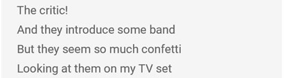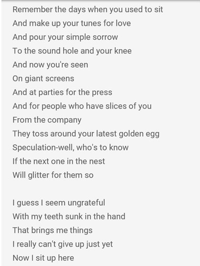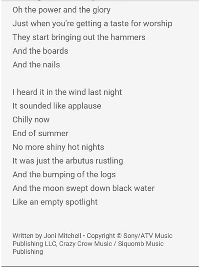 A painter derrailed by circunstance, Joni cumpre em narrativa literária o programa de Anaïs Nin, em registros de intimidade intimidante e intimidatória derrama-se nos diários e nos auto-retratos que periodicamente publica nas capas de seus discos, os diferentes volumes dos seus diários de bordo, na estrada onipresente entre refúgios em MOteis em que expõe a criação da ida sem volta, em vida, da vida de uma jovem educada conforme o figurino, como se vê na terceira faceta de sua vida de artista - a música é o centro e que desenvolve à medida que amadurece a partir de bases sólidas que são as que revela na adolescência de Chelsea Morning e Both Sides Now: plenamente capacitada para a música e para a poesia ou crônica e como desenhista e pintora. Expõe-se a nu e insolente e altiva, dona de si, do verbo e do som em floração orgânica e sem peias, individuada, esteticamente descentrada, erotizada, intimidatória até nos riscos que corre sem correr, de descambar no vulgar ou escorregar em vocalises de matar ou morrer que envolve - em ambos os casos - intimidatoriamente a contraparte, amante ou ouvinte.