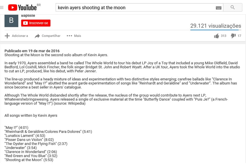 - Ok, então. O sonho acabou. Viva Miles, John McLaughlin's Mahavishnu Orchestra e Shakti, Santana Caravanserai e Devadip Carlos Santana / Alice Coltrane Illuminations, e Weather Report! Um ou outro Dylan magistral com The Band E Blood On The Tracks, um pouco de Bowie aqui, um punhado de Brian Eno ali, John Cale (Paris 1919), Kevin Ayers (Shooting at the Moon, Whatevershebringswesing, Bananamour), The Yes Album, Led Zeppelin III e IV, pelo menos, qualquer Clapton, TUDO o que Francesco Zappa e Joni Mitchell (com ou sem The Crusaders, Jaco Pastorius, Wayne Shorter, Herbie Hancock, Peter Erskine, Charles Mingus, não é coisa pouca) produziram.