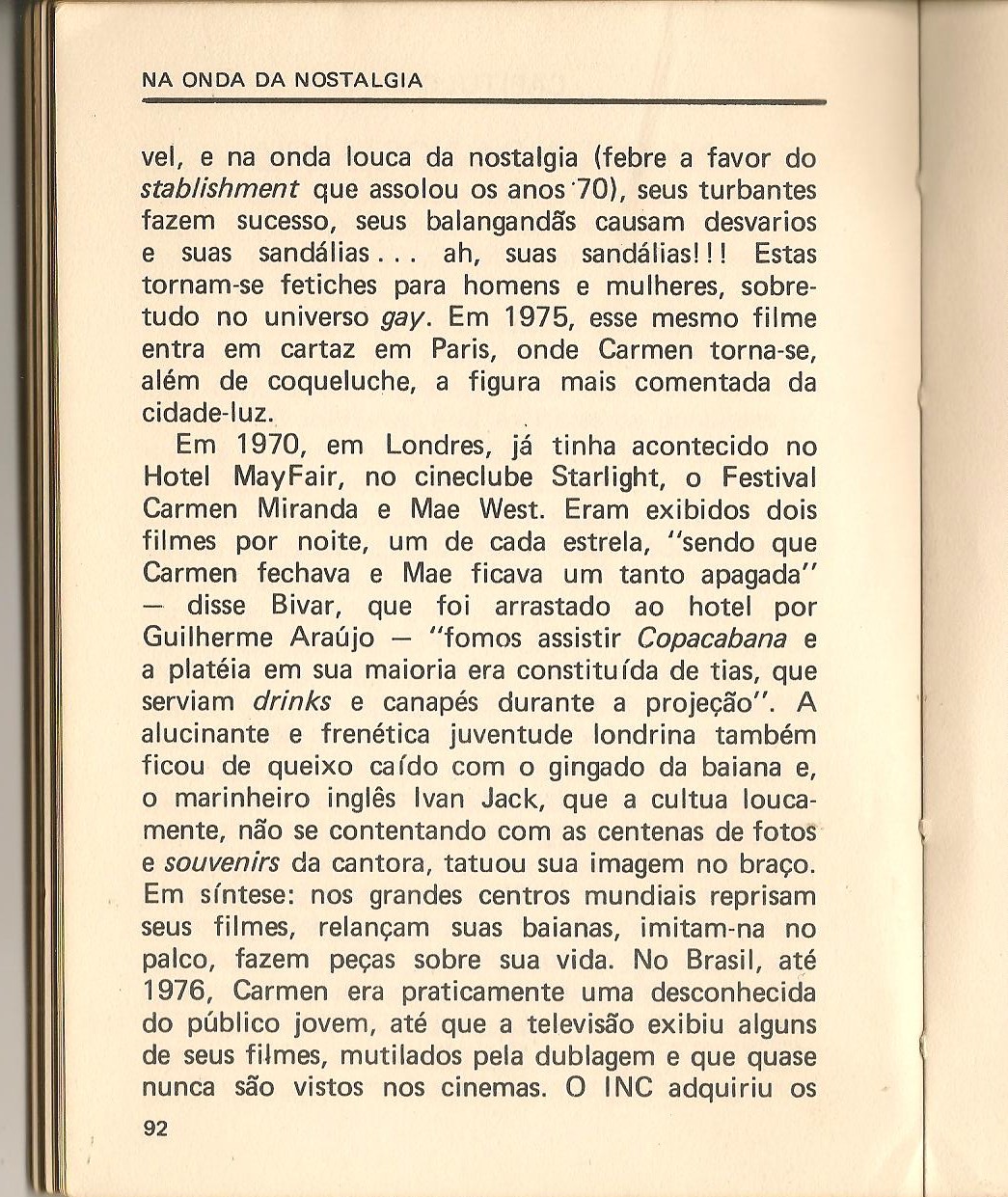 "No filme Harlot (filme chave do início da fase falada de Warhol), em determinado momento Mario Montez menciona Carmen Miranda como 'that tutti-gfrutti hat girl", numa cena em que a conversa gira em torno de bananas. ... A importância e o interesse para nós da encarnação-personagem Mario Montez é justamente essa de que ele é a concreção do clichê latino-americano como um todo, que me faz pensar no que Soy Loco Por Ti, América, de Gil-Capinan, foi para a música Tropicália no Brasil e ainda mais  porque essa imagem-encarnação-personagem foi criada nos States. ... Mario Montez e Carmen Miranda, duas personagens precursoras do que chamarei aqui de Tropicamp, e por isso são superídolos no underground americano."
