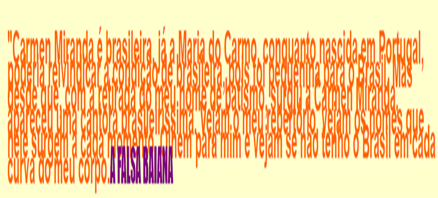 "Carmen Miranda é brasileira, já a Maria do Carmo, conquanto nascida em Portugal, poderia reivindicar a condição de brasileira, pois foi pequenina para o Brasil. Mas desde que, com a retirada do meu nome de batismo, surgiu a Carmen Miranda, apareceu uma cantora brasileiríssima. Vejam o meu repertório, vejam os nomes que nele surgem a cada momento. Olhem para mim e vejam se não tenho o Brasil em cada curva do meu corpo."