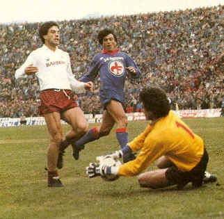 Il "naso di Pisa" in azione nel Fiorentina-Torino del campionato 1982-'83 con l'argentino Daniel Passarella proteggendolo del connazionale Patrizio Hernandez, che è stato sostituito da Junior come il secondo straniero dei granata.