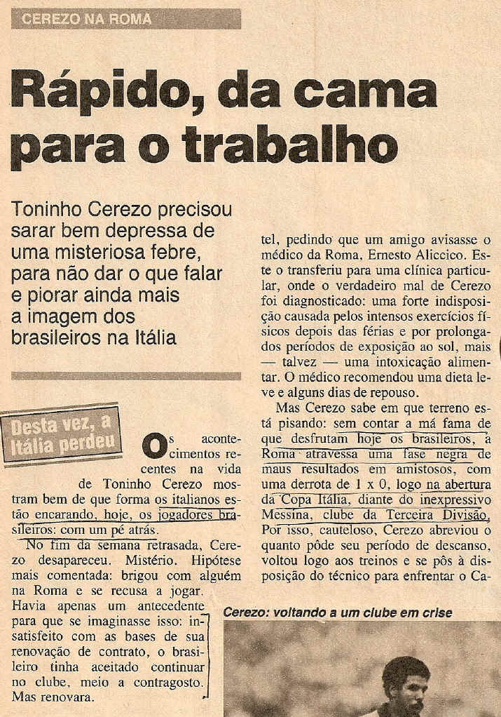 A Roma de Falcao passou a ser a Roma de Cerezo, do polonês Boniek, do dinamarquês Bergreen. De Eriksson. Ganhou uma Copa Itália. Com Cerezo, por mais um ano, ainda vá. Quando ele já tanto cabeça quanto pernas estava em forma ninguém o segurava. Nos momentos difíceis, com aqueles dois braços longos que nem varas abananando de baixo para cima, os dentes arreganhados, incentivava a galera a dar o sangue no tifo, e ela gostava do ardor com que o nero - no bom sentido - vindo de tão longe dava os tubos pelo seu time. Com Cerezo, o malabarista Conti e o bravo jovem segundo homem do meio campo Giannini jogando como um brasiliano, quando ia bem o estádio voltava a explodir de alegria. Mas - honra lhe seja feita - nunca mais foi como no tempo do rei de Roma.