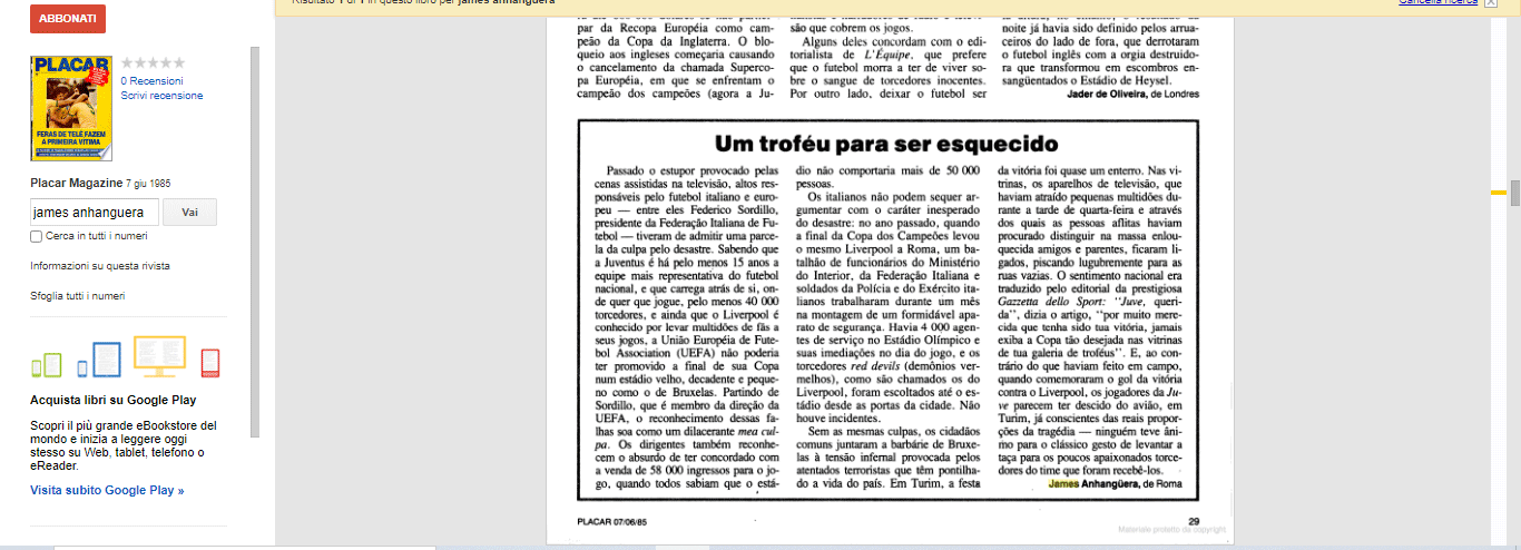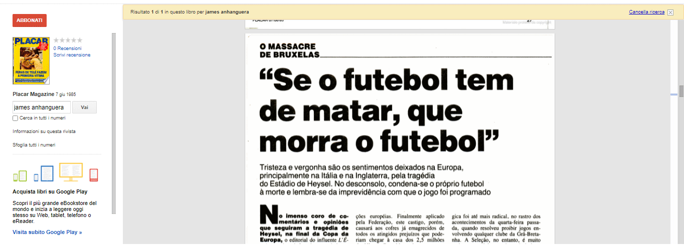 2001      La triste e bella saga dei brasiliani – dalla tragedia del Sarrià alle arene italiane; publicado na íntegra a partir de 2007 no